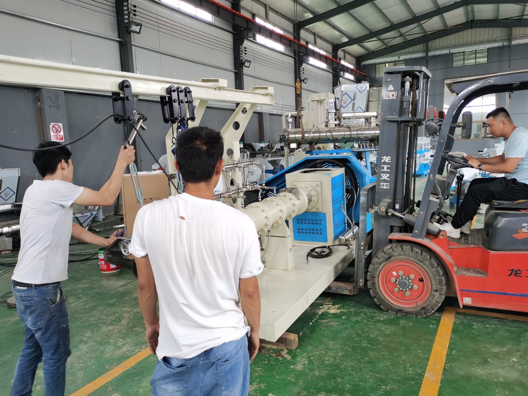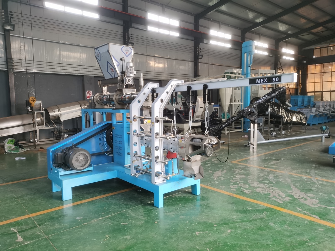 3. Twin-screw feed extruder: The mixed raw materials enter the twin-screws evenly through the feeder. When the materials are extruded by the twin-screws in a high-temperature and high-pressure environment, the composition structure of the raw materials changes and becomes easily absorbed nutrients. , Extruded through the mold, the size of the product is adjusted through the rotary cutting system, and the rotary cutting system can be adjusted by frequency conversion to adjust the length. The mold can be replaced according to the required shape, and the operation is simple. The twin-screw extruder has a preheating function to reduce material loss.